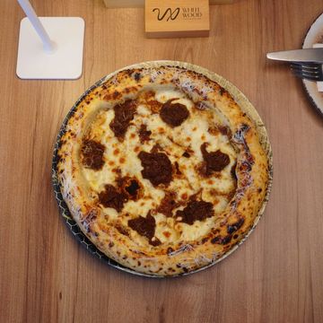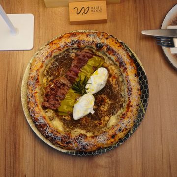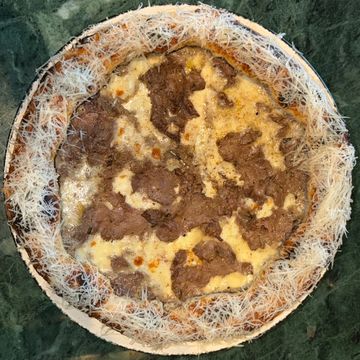 48 Hour Fermented Biga Dough, Rosemary Cream, Mozzarella Cheese, Slow Cooked Angus Brisket Braised in Fermented Grape Juice, Caramelized Onions & Parmesan Snow