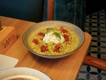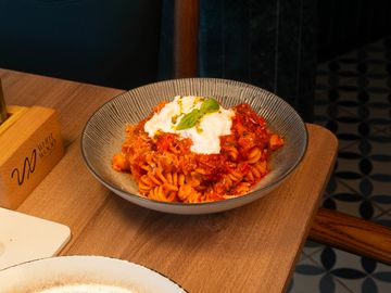 Fusilli Pasta, Pomodoro Sauce, Sundried Tomato, Cherry Tomatoes, tomatoes juice Stracciatella Cheese, Extra Virgin Olive Oil & Fresh Basil