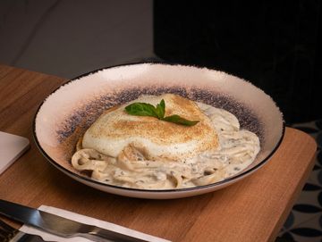 Fettuccini Pasta, Alfredo Sauce, Sautéed Mushroom, Porcini Dust & Parmesan Espuma, Chives & Basil Oil