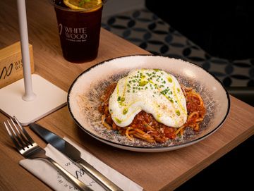 Spaghetti, Wagyu Bolognese Cooked in Fermented Grape Juice , Chives & Parmesan Espuma.
