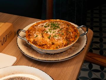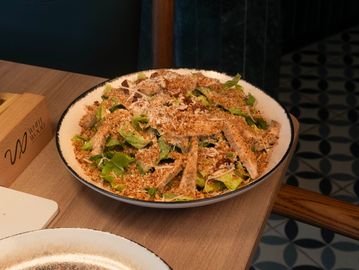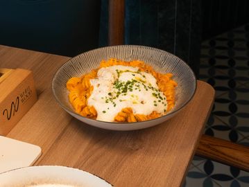 Fusilli Pasta, Slow Cooked Black Angus Brisket braised in fermented grape juice , Mozzarella, Parmegiano Regiano & Crisp Crumbs.