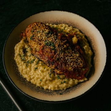 Parmesan & Olive Oil Risotto with Grilled Fresh Seabass Fish topped with Tomato Sauce, Parmesan, Toasted Crumbs & Chives